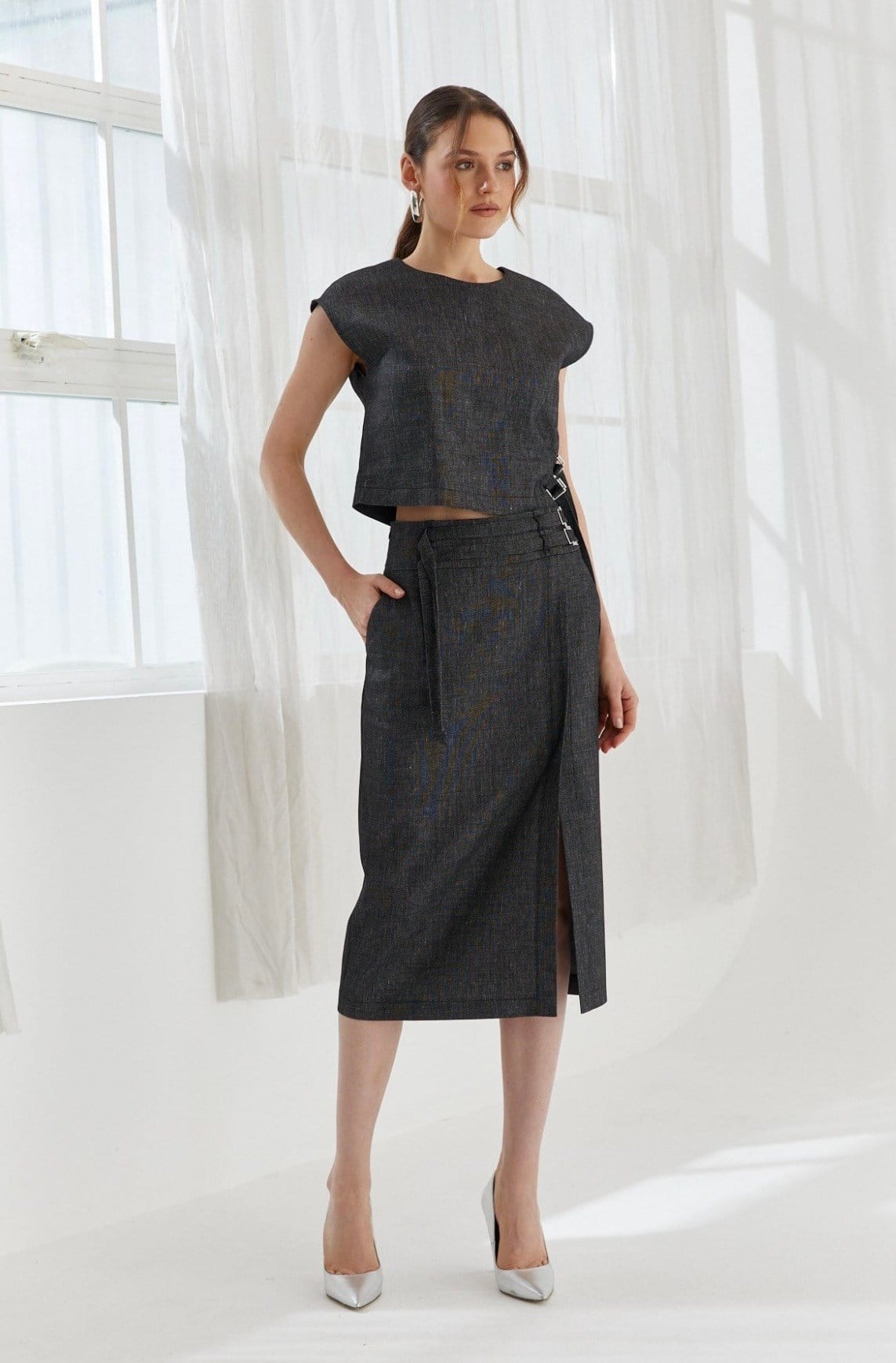 Yüksek Bel Tokalı Midi Etek