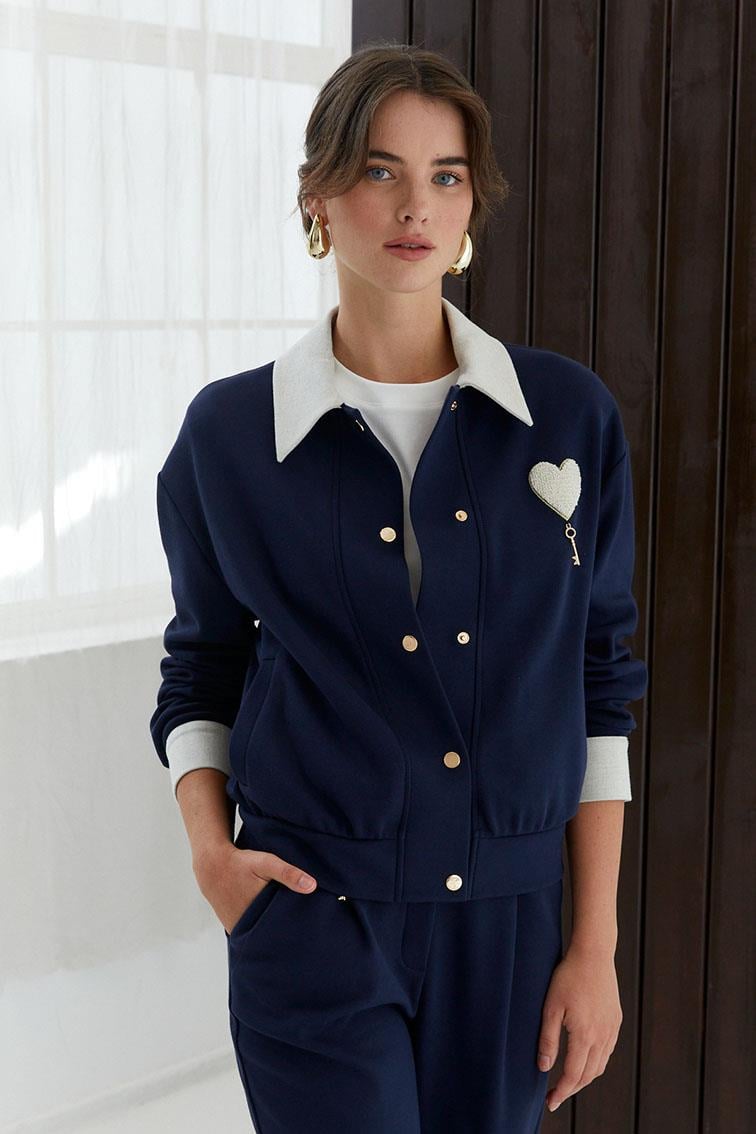 Broş Kalp Detaylı Lacivert Bomber Ceket