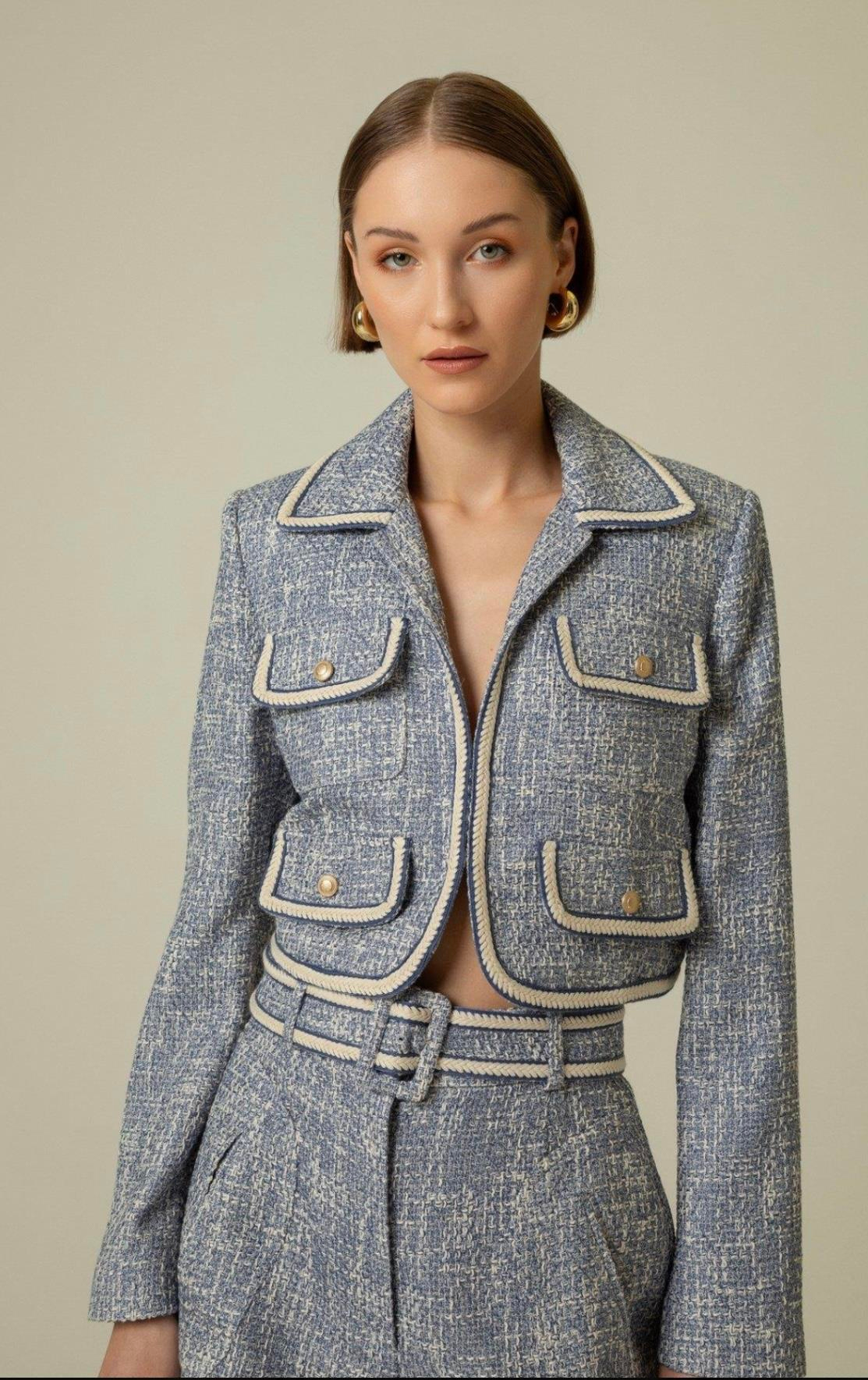 Gold Düğme Detaylı İndigo Crop Ceket