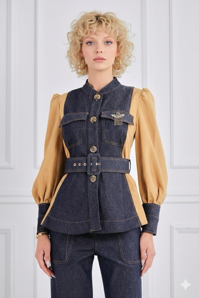 Multi Kumaş Detaylı Kemerli Ceket Üst