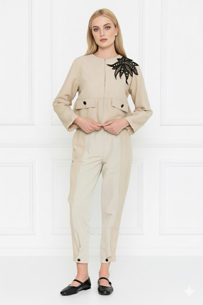 Paça Drop Detaylı Bej Pantolon